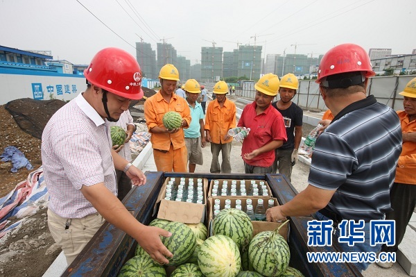 “各位工友快到我這里來,項目上給我們發西瓜和礦泉水了?!?/span>16日上午九點三十分,南京市棲霞區丁家莊保障房工地,中鐵上海工程局市政公司南京丁家莊保障房項目現場,揮汗作業的幾十名作業人員領取了項目部為他們準備的降溫用品。