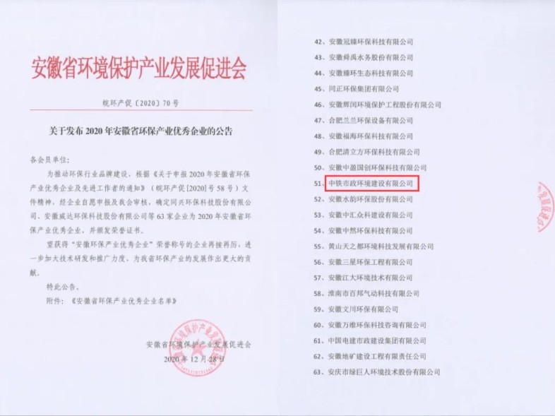 2020年12月,安徽省環境保護產業發展促進會發布“2020年安徽省環保產業優秀企業”公告、“2020年安徽省AAA級環保施工示范工地”通知及“2020年安徽省環保產業優秀企業及先進工作者”的公告。
